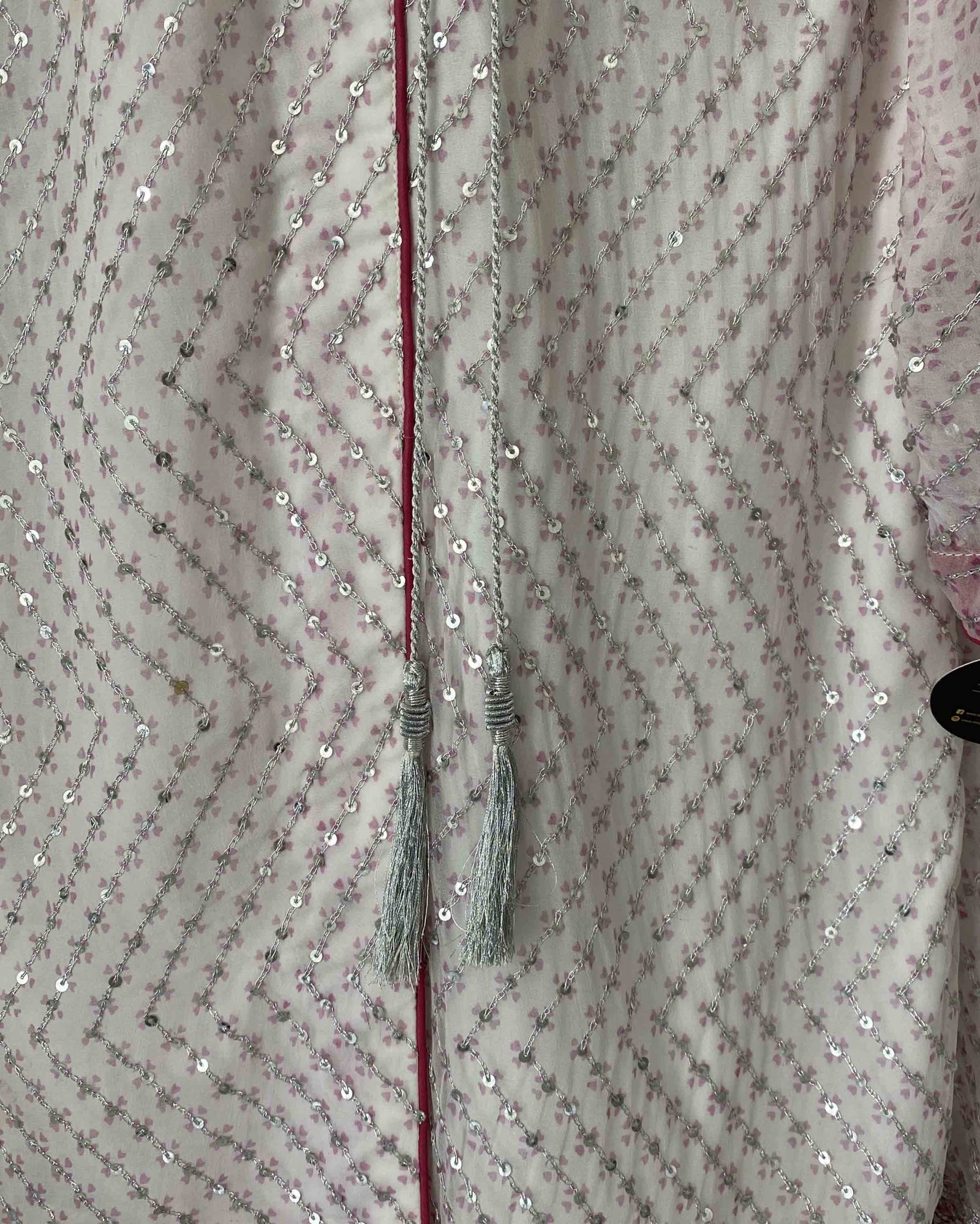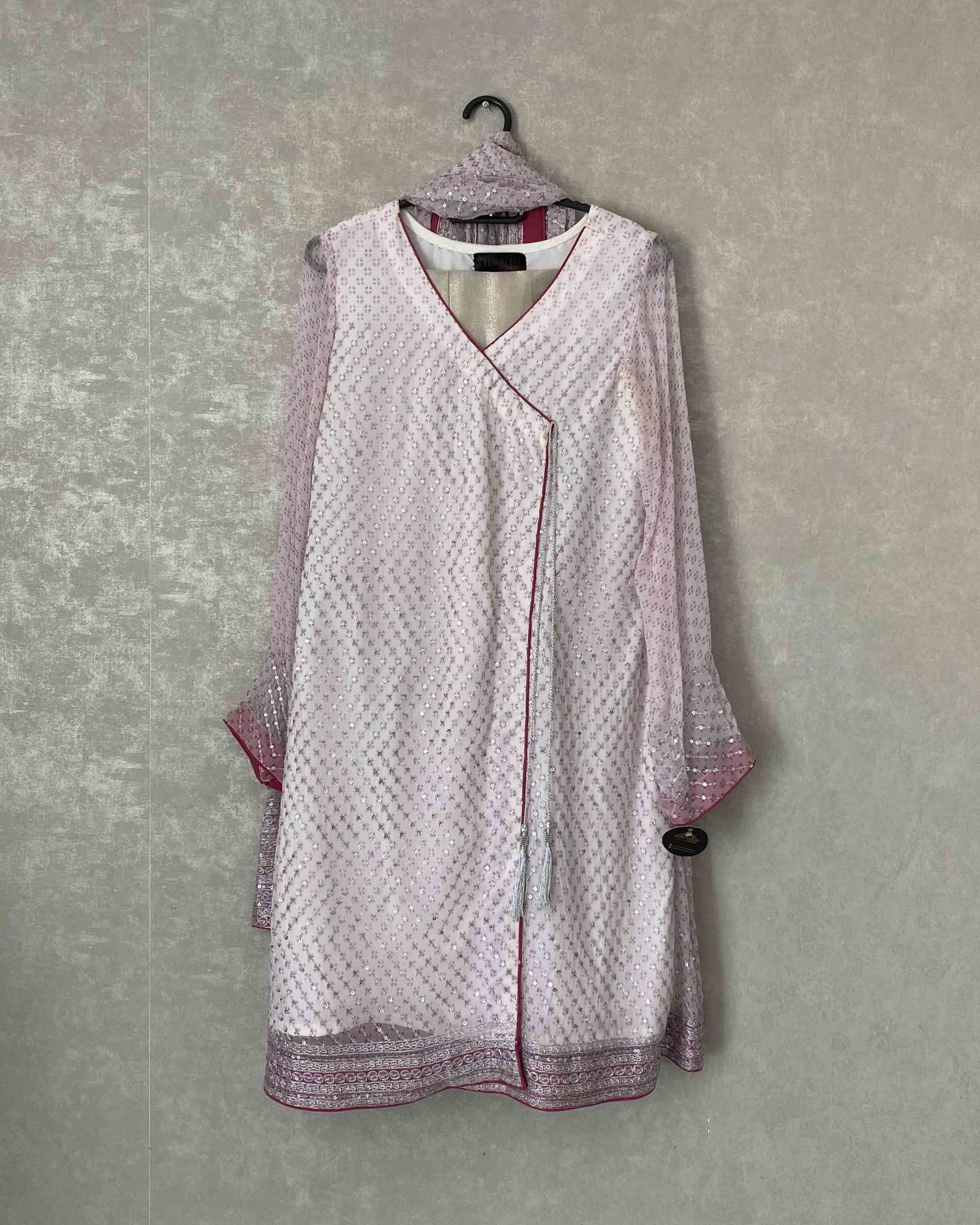 • Pure chiffon shirt with elegant zari work on shirt and dupatta with tussels on both borders. Ijaar pants included.