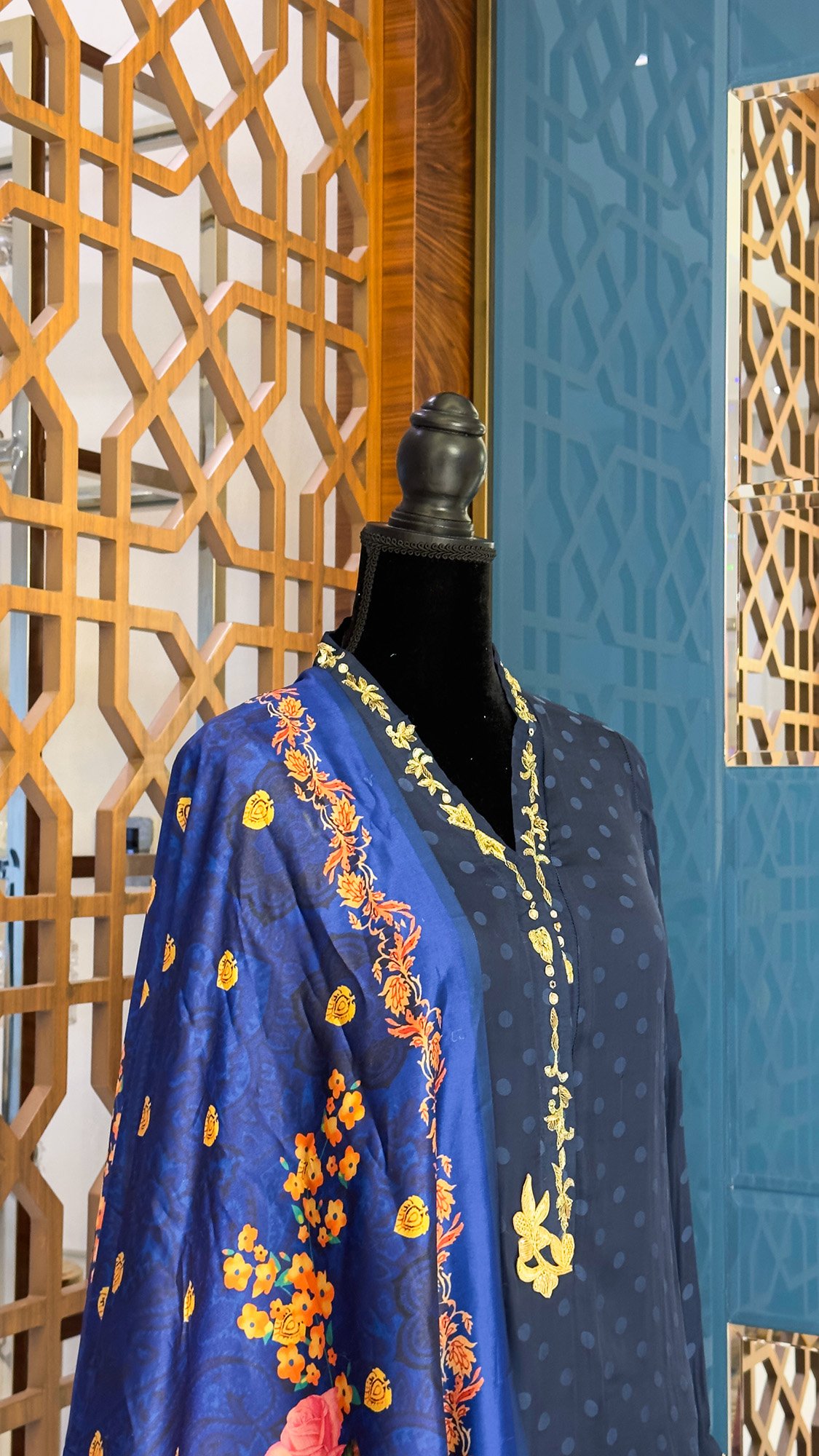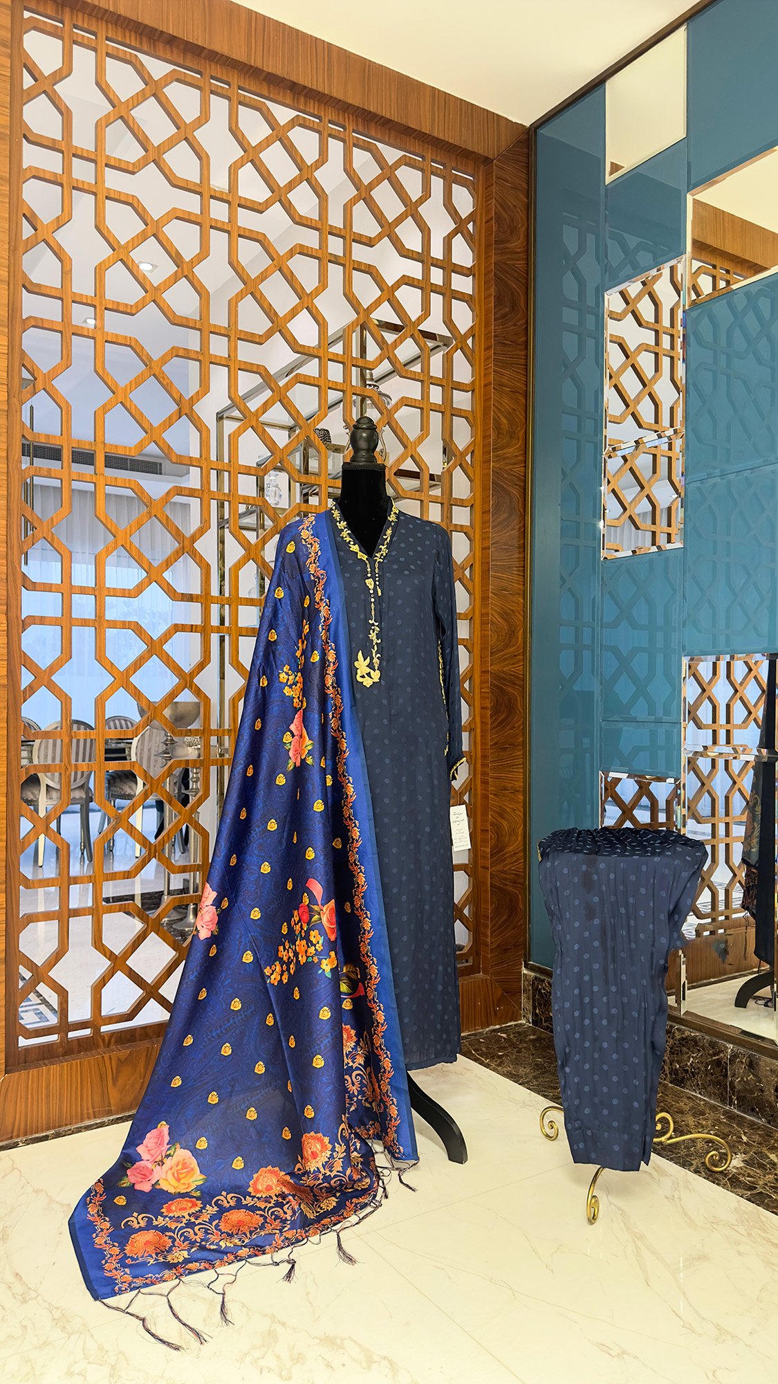 A vibrantly crafted outfit with a three-piece Silk suit in blue color.